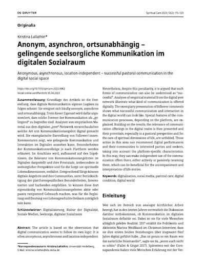 Grundlage des Artikels ist die Feststellung, dass digitale Kommunikation eigenen Logiken zu folgen scheint: Sie ereignet sich häufig anonym, asynchron und ortsunabhängig. Trotz dieser Eigenart wird dafür argumentiert, dass solche Formen der Kommunikation als „gelingend“ zu begreifen sind. Analysen von empirischem Material aus dem digitalen „yeet“-Netzwerk veranschaulichen welche Art von Kommunikationsangebot digital gemacht wird. Die exemplarische Darstellung von Follower/-innen-Kommentaren zeigt, wie gelingende Kommunikation und Interaktion im Digitalen aussehen kann. Besonderheiten der Kommunikationsvollzüge je nach Plattform werden erläutert. Im Anschluss wird, aufbauend auf den Ergebnissen, die Relevanz von Kommunikationsangeboten im Digitalen dargestellt und ihre Potenziale, insbesondere in seelsorglicher Perspektive und für die Sorge um spirituelle Lebensdimensionen, entfaltet. Entsprechend Tätige können digitale Angebote und ihre Communities, unter Berücksichtigung der plattformspezifischen Besonderheiten, Interessierten und Suchenden empfehlen. So können diese dort eigenständig von Kommunikationsangeboten aktiv oder passiv rezipierend Gebrauch machen, was für die Begleitung und Deutung von Lebensgeschichte heilsam zuträglich sein kann.