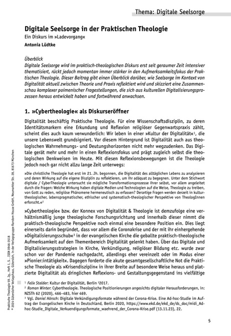 Lüdtke, A. (2024). Digitale Seelsorge in der Praktischen Theologie: Ein Diskurs im »Ladevorgang«. Praktische Theologie, 59(1), 5–13. https://doi.org/10.14315/prth-2024-590103