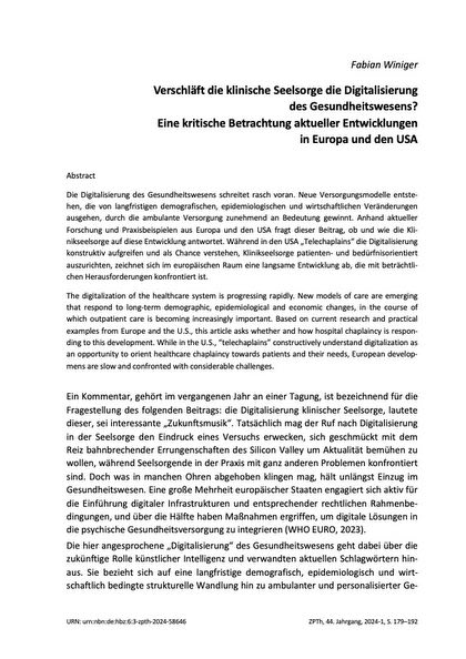 Die Digitalisierung des Gesundheitswesens schreitet rasch voran. Neue Versorgungsmodelle entstehen, die von langfristigen demografischen, epidemiologischen und wirtschaftlichen Veränderungen ausgehen, durch die ambulante Versorgung zunehmend an Bedeutung gewinnt. Anhand aktueller Forschung und Praxisbeispielen aus Europa und den USA fragt dieser Beitrag, ob und wie die Klinikseelsorge auf diese Entwicklung antwortet. Während in den USA „Telechaplains“ die Digitalisierung konstruktiv aufgreifen und als Chance verstehen, Klinikseelsorge patienten- und bedürfnisorientiert auszurichten, zeichnet sich im europäischen Raum eine langsame Entwicklung ab, die mit beträchtlichen Herausforderungen konfrontiert ist.