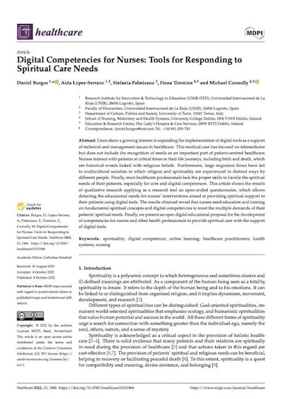 Burgos, D., López-Serrano, A., Palmisano, S., Timmins, F., & Connolly, M. (2022). Digital Competencies for Nurses: Tools for Responding to Spiritual Care Needs. Healthcare, 10(10), 1966. https://doi.org/10.3390/healthcare10101966