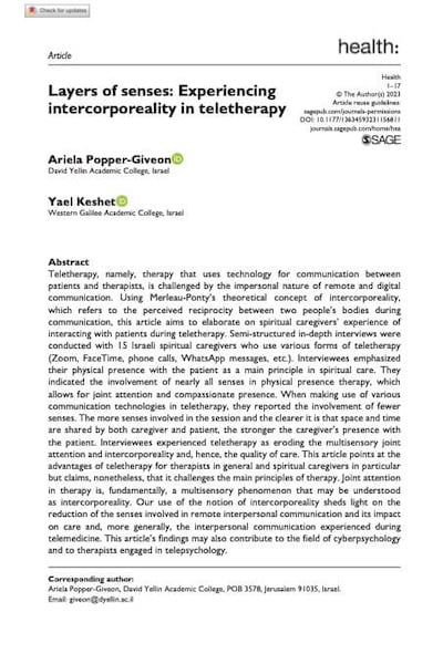Teletherapy, namely, therapy that uses technology for communication between patients and therapists, is challenged by the impersonal nature of remote and digital communication. Using Merleau-Ponty’s theoretical concept of intercorporeality, which refers to the perceived reciprocity between two people’s bodies during communication, this article aims to elaborate on spiritual caregivers’ experience of interacting with patients during teletherapy. Semi-structured in-depth interviews were conducted with 15 Israeli spiritual caregivers who use various forms of teletherapy (Zoom, FaceTime, phone calls, WhatsApp messages, etc.). Interviewees emphasized their physical presence with the patient as a main principle in spiritual care. They indicated the involvement of nearly all senses in physical presence therapy, which allows for joint attention and compassionate presence. When making use of various communication technologies in teletherapy, they reported the involvement of fewer senses. The more senses involved in the session and the clearer it is that space and time are shared by both caregiver and patient, the stronger the caregiver’s presence with the patient. Interviewees experienced teletherapy as eroding the multisensory joint attention and intercorporeality and, hence, the quality of care. This article points at the advantages of teletherapy for therapists in general and spiritual caregivers in particular but claims, nonetheless, that it challenges the main principles of therapy. Joint attention in therapy is, fundamentally, a multisensory phenomenon that may be understood as intercorporeality. Our use of the notion of intercorporeality sheds light on the reduction of the senses involved in remote interpersonal communication and its impact on care and, more generally, the interpersonal communication experienced during telemedicine. This article’s findings may also contribute to the field of cyberpsychology and to therapists engaged in telepsychology.
